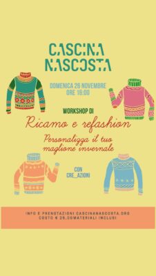 Disegneremo un bozzetto del maglione da rinnovare per poi lavorare in modo pratico sul vecchio indumento ricamandolo. In questo workshop impareremo ad allungare il ciclo di vita del nostro maglione creando un pezzo unico che rinnovi il nostro armadio. A ogni partecipante sarà lasciato un piccolo manuale per poter continuare a sperimentare. È un corso […]